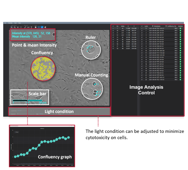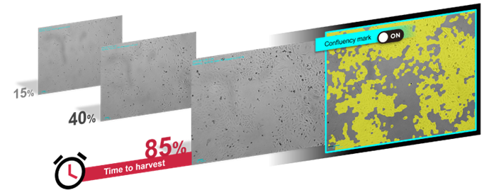 You can review these images to determine the optimal time for cell harvesting or set an alarm to notify you when the appropriate confluency level has been reached (currently in development).