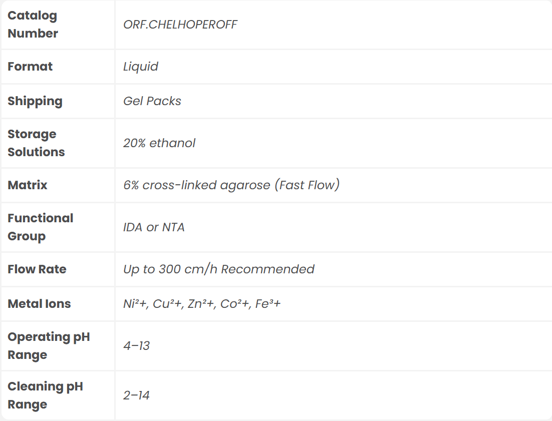 Chelating Hoperose™ FF is a high-performance chelating chromatography resin engineered for the selective capture and purification of metal-binding biomolecules. Built on a robust, cross-linked agarose matrix, this resin provides excellent mechanical stability, high flow properties, and superior binding capacity for metal ions. Its uniform bead size and optimized ligand density make it ideal for both research and large-scale purification.
