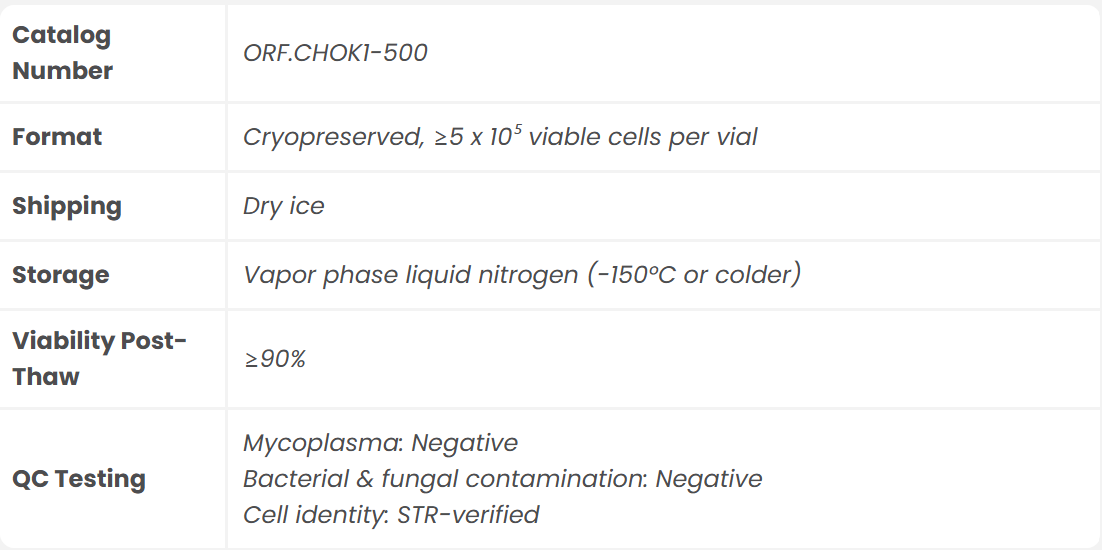 CHO-K1 (Chinese Hamster Ovary, K1 subclone) is a robust, widely used mammalian cell line derived from the ovary of the Chinese hamster (Cricetulus griseus). It is the preferred workhorse for biologics development and manufacturing, with over 70% of FDA-approved therapeutic proteins produced in CHO cells. ORF Biologics provides authenticated, high-viability CHO-K1 cells with proven performance in protein expression, synthetic biology, and basic research applications.