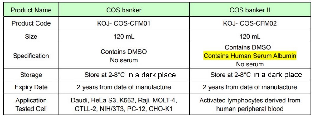 * "Cos Banker II" contains Human Serum Albmin (GMP Grade) as Stabilizer