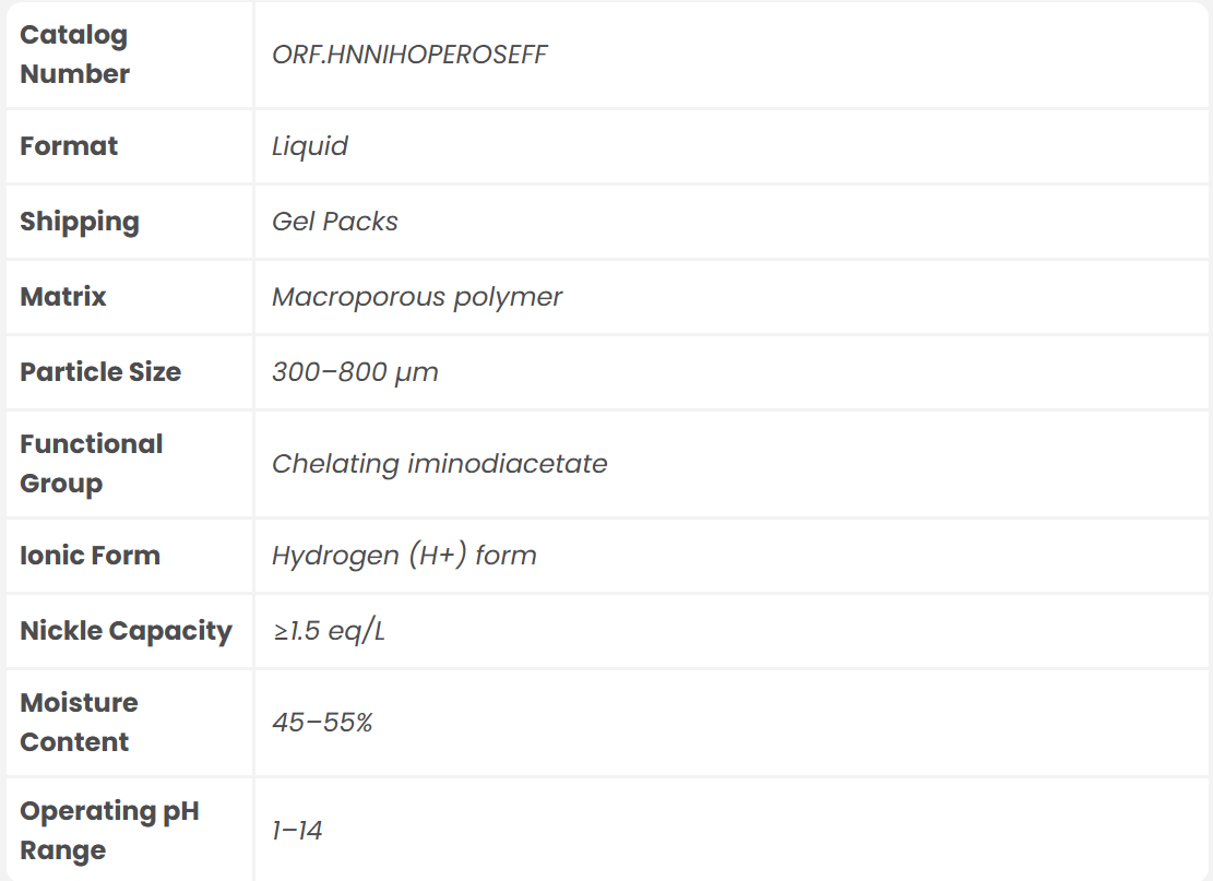 HN Nickel Hoperose™ FF is engineered for efficient and selective recovery of nickel ions from process streams. Built on a durable macroporous polymer matrix, it provides exceptional mechanical strength and chemical resistance under harsh industrial conditions.