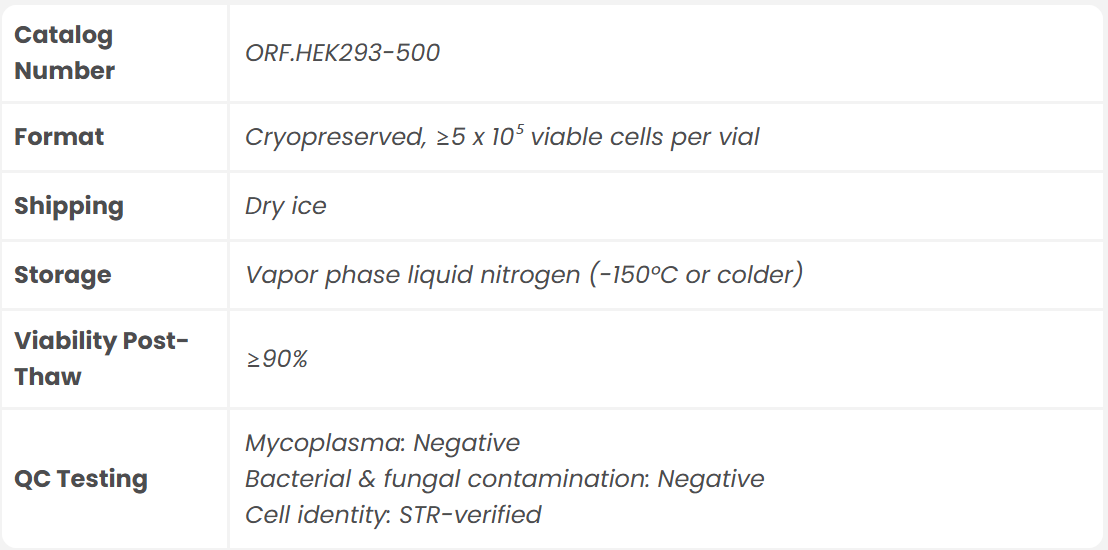 HEK293 (Human Embryonic Kidney 293) is one of the most commonly used mammalian cell lines for protein expression, gene editing, and viral vector production. Originally derived from human embryonic kidney cells, this line has been adapted for exceptional ease of transfection, high protein yield, and compatibility with a variety of expression systems. ORF Biologics provides authenticated, high-viability HEK293 cells that are ideal for both research and bioproduction applications.