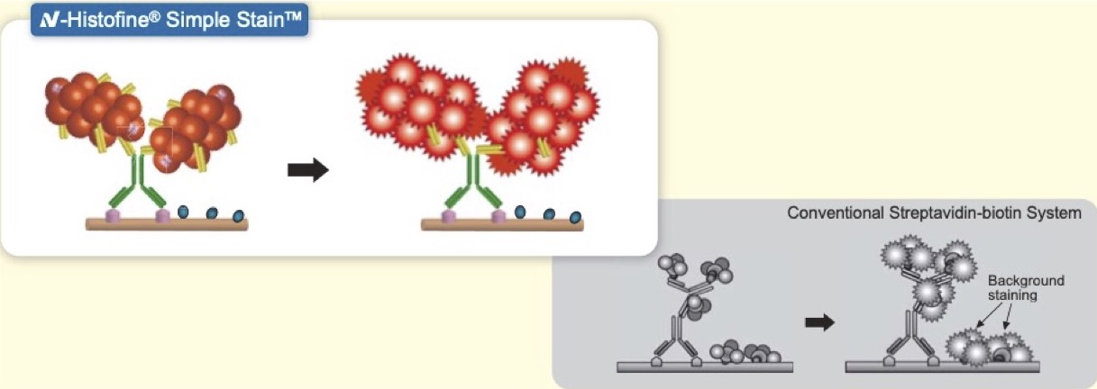 N-Histofine® Simple Stain™ MAX PO (G) belongs to a family of immunohistochemical detection systems (from Nichirei Biosciences) designed to enhance staining of formalin-fixed paraffin-embedded (FFPE) human tissue sections. It deploys Nichirei Bio’s patented Universal Immuno-enzyme Polymer (UIP) technology that combines amino acid polymers with multiple molecules of peroxidase (PO) and secondary antibodies reduced to Fab’ fragments. To eliminate background staining, secondary antibodies undergo solid-phase adsorption with human serum. Simple Stain™ MAX PO comes in versions optimized for use with primary antibodies from mouse (M), rabbit (R), goat (G) and both mouse and rabbit (MULTI). For more information please explore below and visit our Nichirei Biosciences Dashboard.