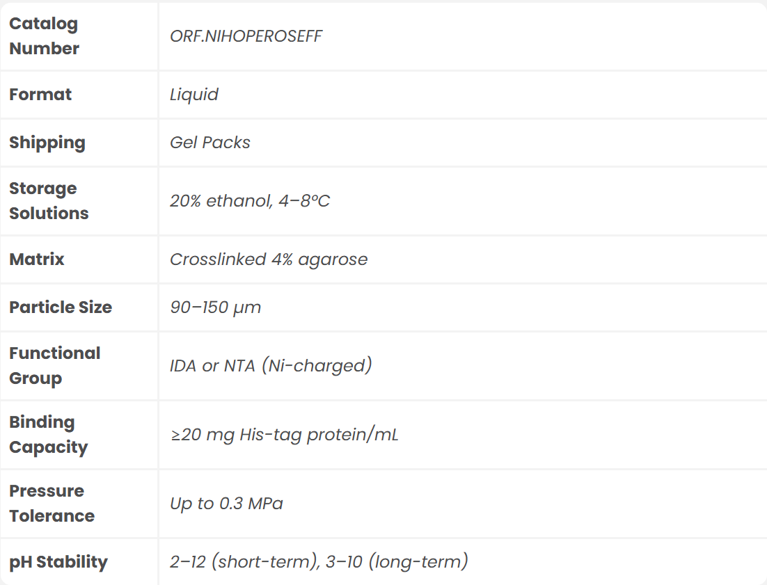 Nickel Hoperose™ FF Resin utilizes iminodiacetic acid (IDA) or nitrilotriacetic acid (NTA) ligands immobilized on a strong agarose matrix, charged with Ni²⁺ ions for selective purification of His-tag recombinant proteins. It provides high mechanical strength, low nonspecific binding, and robust reusability.