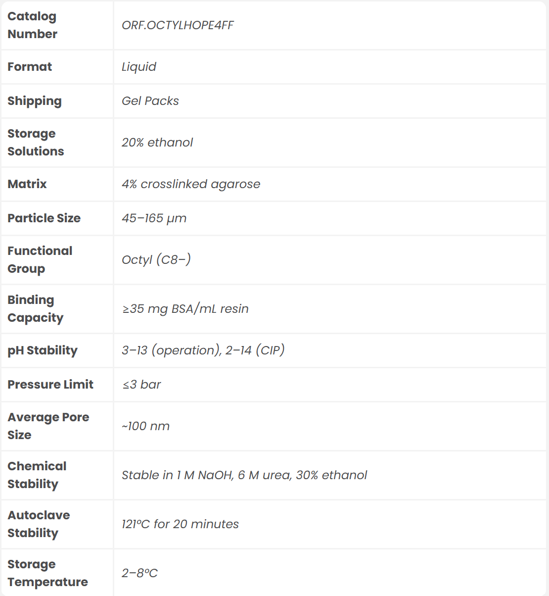 Octyl Hoperose™ 4FF Resin is a high-performance hydrophobic interaction chromatography (HIC) medium designed for the purification of proteins and biomolecules based on surface hydrophobicity. Built on a 4% crosslinked agarose matrix and functionalized with octyl (C8) groups, it provides high mechanical stability, excellent flow characteristics, and reproducible separations from lab to industrial scale.