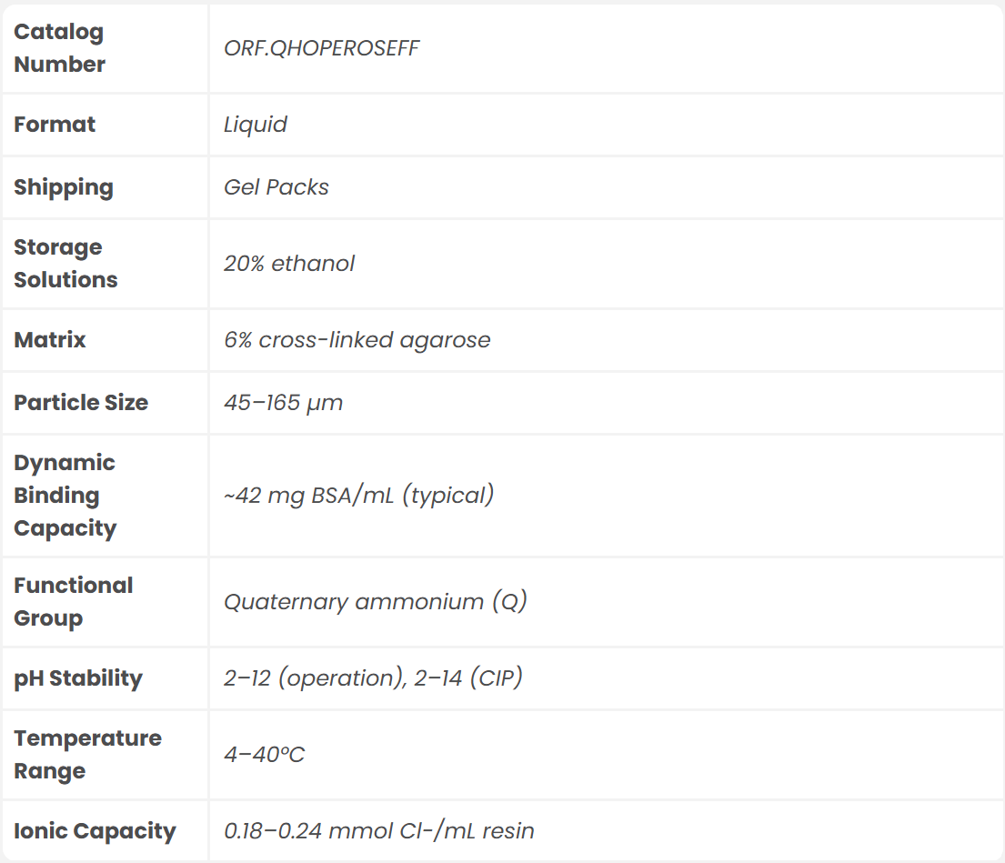 Q Hoperose™ FF Resin is a high-flow, strong anion-exchange chromatography medium engineered for robust, scalable biomolecule purification. Featuring a hydrophilic, cross-linked agarose matrix functionalized with quaternary ammonium (Q) groups, it ensures reliable performance across research and industrial workflows.