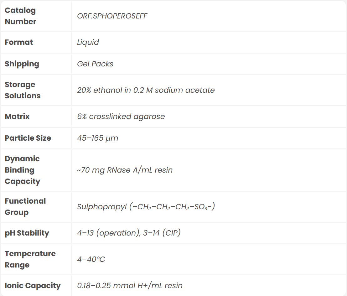 SP Hoperose™ FF Resin is a robust strong cation-exchange chromatography medium designed for protein capture and purification at laboratory and process scales. Built on a hydrophilic 6% agarose matrix and functionalized with sulphopropyl (–CH₂–CH₂–CH₂–SO₃⁻) groups, it provides excellent flow rates, stability, and scalability.